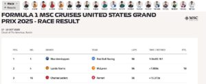 Sainz, Antonelli ile yaşadığı çarpışmanın ardından pist dışına çıkarak günün tek yarış dışı kalan sürücüsü oldu. Austin’deki yarışın ardından sıralamada ise Verstappen, Sürücüler Şampiyonası’nda Piastri’nin sadece 40 puan gerisinde yer alırken, Norris ise takım arkadaşından sadece 14 puan geride. (kaynak:ankaranethaber.com)