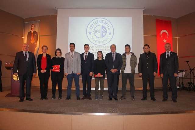 ASO Teknik Koleji’nde 2017-2018 eğitim öğretim yılı birinci döneminde 417 öğrenci karne alırken dereceye giren öğrencilere Başkan Nurettin Özdebir tarafından çeşitli hediyeler verildi.