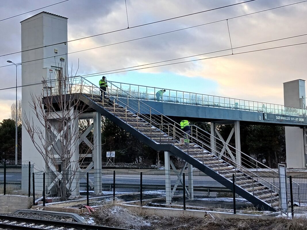 Bu kapsamda AOÇ Gazi Tren İstasyonu yakınındaki Gazi Mahallesi Yaya Üst Geçidi ve merdivenlerde kar temizleme ve tuzlama çalışması yapıldı.