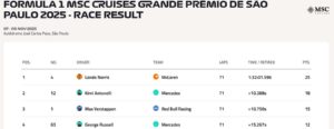 Lando Norris, büyüleyici Sao Paulo Grand Prix’sindeki zaferinin ardından Sürücüler Şampiyonası sıralamasında rakiplerinden daha da önde yer aldı. Kimi Antonelli, Max Verstappen’i geride bırakarak ikinci oldu.