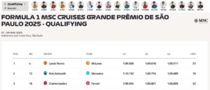 Aston Martin’den Fernando Alonso ve Williams’tan Alex Albon, yedi kez Dünya Şampiyonu Lewis Hamilton’un hemen önünde 11. ve 12. sıralarda yer alırken, takım arkadaşları Lance Stroll ve Carlos Sainz ise 14. ve 15. sıralarda yer aldı. 1. çeyrekteki en büyük haber, Red Bull pilotu Verstappen’in çekişte zorlandıktan sonra seansı 16. sırada tamamlamasıydı. Sıralama turlarına SQ1’de veda eden takım arkadaşı Yuki Tsunoda 19. sırada yer aldı. Haas’tan Esteban Ocon ve Alpine pilotu Franco Colapinto sırasıyla 17. ve 18. sıralarda yer aldı. Kick Sauber ise Gabriel Bortoleto’nun Sprint’teki kazasının ardından aracını piste çıkaramadı ve onu 20. sırada bıraktı. (kaynak:ankaranethaber.com)