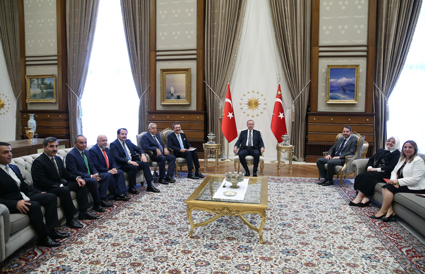 Cumhurbaşkanı Recep Tayyip Erdoğan, Türkiye Odalar ve Borsalar Birliği (TOBB) Başkanı Rifat Hisarcıklıoğlu ve beraberindeki heyeti Cumhurbaşkanlığı Külliyesi’nde kabul etti.