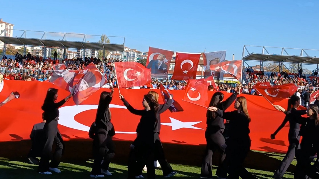 Gösterilerde günün en dikkat çekici etkinliklerinden biri öğrencilerin statta açtıkları devasa Türk Bayrağı oldu.