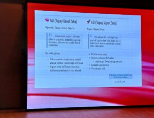 Yapay Zekâyla ilgili geçmişte yapılan tahminlere de değinen Begüm Yurdakök Dikmen, “Birkaç farklı araştırmacının belirttiği üzere ki, bu 1999 yılında yapılan bir öngörü, yapay zekâ 2045 yılında tüm insan beyninin sunacağı bilgi işleminin, işleme kısmını geçeceğine dair. Şu anda bir insanı geçmeye çok yakın bir noktadayız günümüzde. 2045’te tüm insanların bu işleme yapısını geçecek şekilde, bu bilgi işleme eksponansiyel düzeyde artıyor. Yani çok hızlı bir artış söz konusu burada. Dolayısıyla bu artışı bizim bir şekilde yakalamamız gerekiyor. Yani biz şu anda diyoruz ya örneğin hayvanın bir lokasyon üzerindeki değişikliği, hareket verisi, ruminasyon, çiğneme, yemleme, atlama birçok sensörler üzerinde aldığımız verilerle bir olası hastalığı ilişkilendirebiliyoruz. Ve/veya yaptığımız tedavinin iyi olup olmadığını görebiliyoruz. Bu Yapay Genel Zekâ (Artificial General Intelligence/AGI) diye geçiyor şu anda.