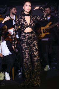 Ebru Yaşar, önceki akşam Günay sahnesinde müzik dolu bir geceye imza attı. Sahneye dantelli siyah tulumuyla çıkan Yaşar, zarafeti ve güçlü sahne duruşuyla davetlilerden tam not aldı.