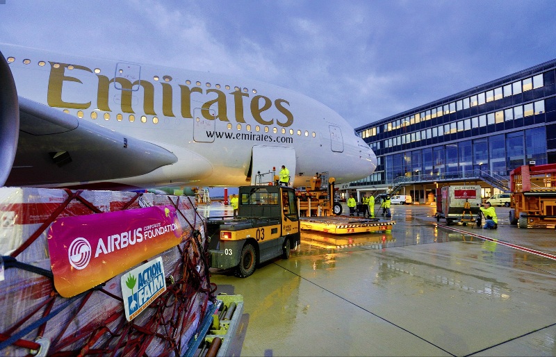 2008 yılından beri, Emirates A380, ayrıca, Airbus Vakfı ile birlikte yaptığı insani yardım uçuşlarıyla 120 ton gıda ve hayati gereklilikteki acil durum malzemesinin taşımasını yerine getirdi.