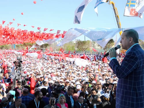 1991 yılından beri istikrarlı bir hükûmet modeliyle yönetilmiş olması hâlinde Türkiye’nin bugün bulunduğu yerin iki katı daha ileride olacağını, 11 bin dolar olan kişi başına düşen millî gelirin 22 bin dolar alacağını kaydeden Cumhurbaşkanı Erdoğan, “Siz, Anayasa değişikliğine karşı çıkanların yalanlarına bakmayın, hesap ortada. Bu milletin cebinden paralarını çalanlar, hak etmedikleri bir gücü kullanarak kendilerine paralel iktidar kuranlar için 16 Nisan elbette kâbus günüdür. Onun için istemiyorlar. Ama istikrar ve güven ortamını garanti altına alacak Cumhurbaşkanlığı Hükûmet Sistemiyle, 2023 hedeflerine ulaşarak, dünyanın en büyük 10 ekonomisinden biri olacak Türkiye için 16 Nisan, düğün günüdür, bayram günüdür” diye ekledi.
