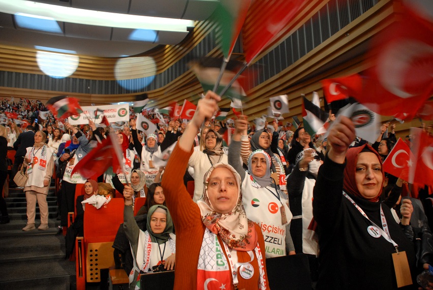 The event of HAK-İŞ Confederation, which organized the “International Solidarity Conference with Palestinian Women” within the scope of March 8, International Working Women’s Day, was held at ATO Congresium with the participation of 60 unionists from 37 countries and nearly 5 thousand HAK-İŞ women from 81 provinces of TRNC and Turkey.