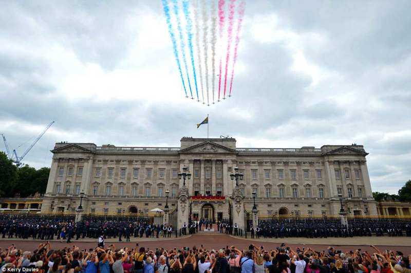 İngiltere Kraliçesi II. Elizabeth ve muhteşem dörtlü olarak bilinen Harry, Meghan, William ve Kate’de dahil tüm kraliyet ailesi gösterileri sarayın balkonundan izledi.