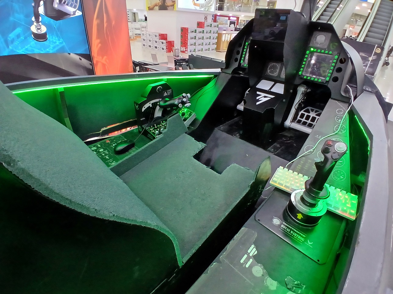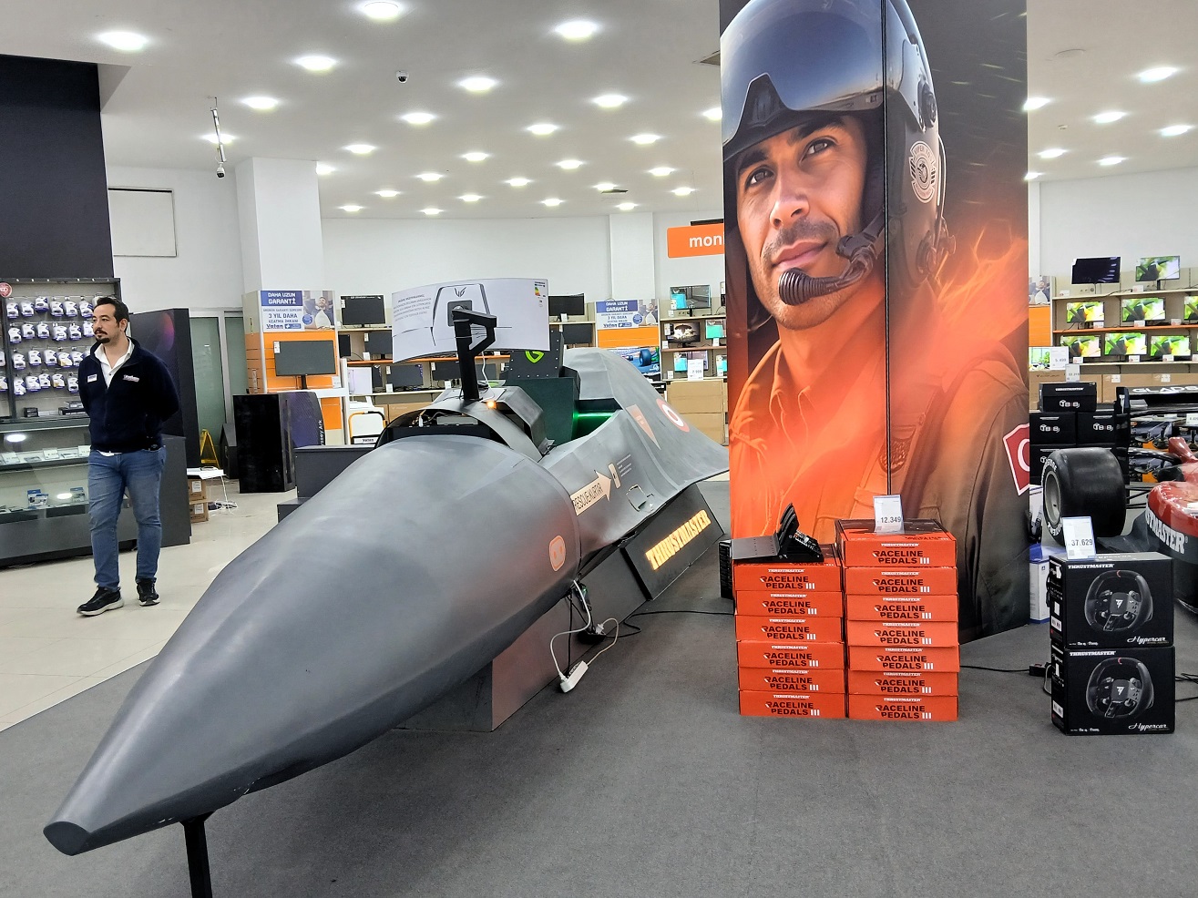 F-16 savaş uçağının birebir ölçekli (mock-up) kokpitinde uçuş simülasyonunu deneyimlemek isteyen havacılık tutkunları, mağaza personelinden yardım alarak bu hizmetten ücretsiz olarak yararlanabiliyor.
