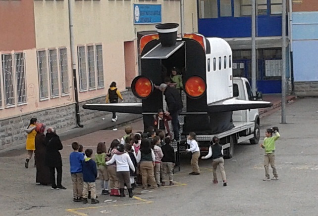 Üzerine monte edildiği kamyonetle Şehit Mutlu Can Kılıç Ortaokulu bahçesine getirilen mekik astronotların eğitiminde kullanılmak üzere tasarlanmış simülatörleri aratmıyor.