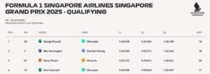 Mercedes sürücüsü George Russell, Singapur GP’sinde Verstappen ve Piastri’yi geride bırakarak pole pozisyonunu aldı.