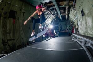 Tüm bunlar, 1950’lerden beri göklerde olan ve neredeyse klasikleşen Hercules C-130 uçağında gerçekleştirildi: Aynı uçak “Hızlı ve Öfkeli 7” (2015) filminde de kullanıldı. Kaykay macerasını kaydeden ekipte, Tom Cruise’un oynadığı “Görevimiz Tehlike” (Mission: Impossible – Fallout Effect) (2018) kaydına katılan video yapımcısı ve paraşütçü Craig O’Brien vardı. Kayıt, Ağustos 2022’de Oscar ödüllü yönetmen ve senarist Quentin Tarantino’nun kullandığı aynı Panavision lensiyle yapıldı.