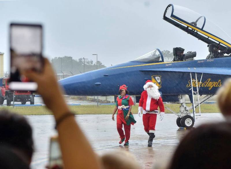 ABD Deniz Kuvvetleri Blue Angels Hava Akrobasi ekibinin bulunduğu Pensacola Üssü’ne sürpriz bir ziyaret gerçekleştiren Noel Baba yağışlı havaya rağmen programını aksatmadı.