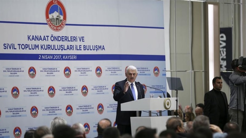 Başbakan Yıldırım, Türkiye’nin, yalnızca bölgesinde güçlü olmasının yeterli olmadığına, güçlü kalmak mecburiyetinde olduğuna işaret ederek, “Çünkü Türkiye, tarihin her döneminde çok stratejik konumda olmuş ve bu topraklar, dünyanın gidişatını değiştiren bölgeler olmuş. Bugün bakalım etrafımıza, bütün olaylar bizim etrafımızda. Kuzeyimizde, güneyimizde, doğumuzda hatta batımızda, her tarafta bir huzursuzluk, karışıklık var. Bütün bu şartlar içinde Türkiye’nin dimdik ayakta kalması gerekiyor. Bunu bildikleri için de ‘Türkiye geleceği inşa edecek adımları atmasın.’ diye var güçleriyle, en son gayretleriyle çalışıyorlar. Tam bir ittifak, şer ittifakı var. Kandil oradan bas bas bağırıyor, ‘Aman evet çıkmasın, evet çıkarsa biz biteriz.’ Buradan, Kayseri’den söylüyorum ‘evet’ çıkacak, onlar da bitecek. Onların kandillerini söndüreceğiz.” ifadelerini kullandı.